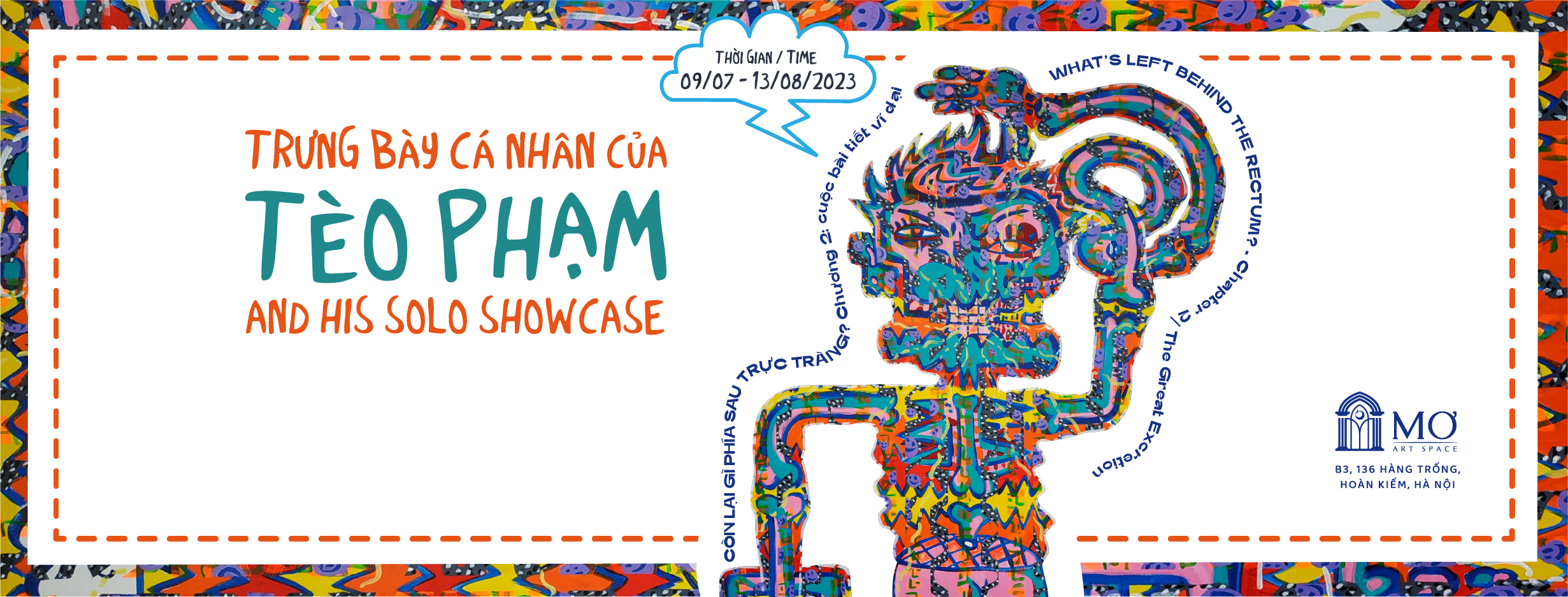 Drawing inspiration from the philosophical writings of Martin Heidegger and Friedrich Nietzsche, the vibrant works of Tèo Phạm leave a strong impression on viewers with the concept of "excretion". In his practice, he deliberately does not interfere much in terms of content and techniques, while calling his creative process a spiritual excrement - a grand excrement, implying a periodicity in what the mind and the spirit absorb and subsequently generate, the cycle of cause and effect.